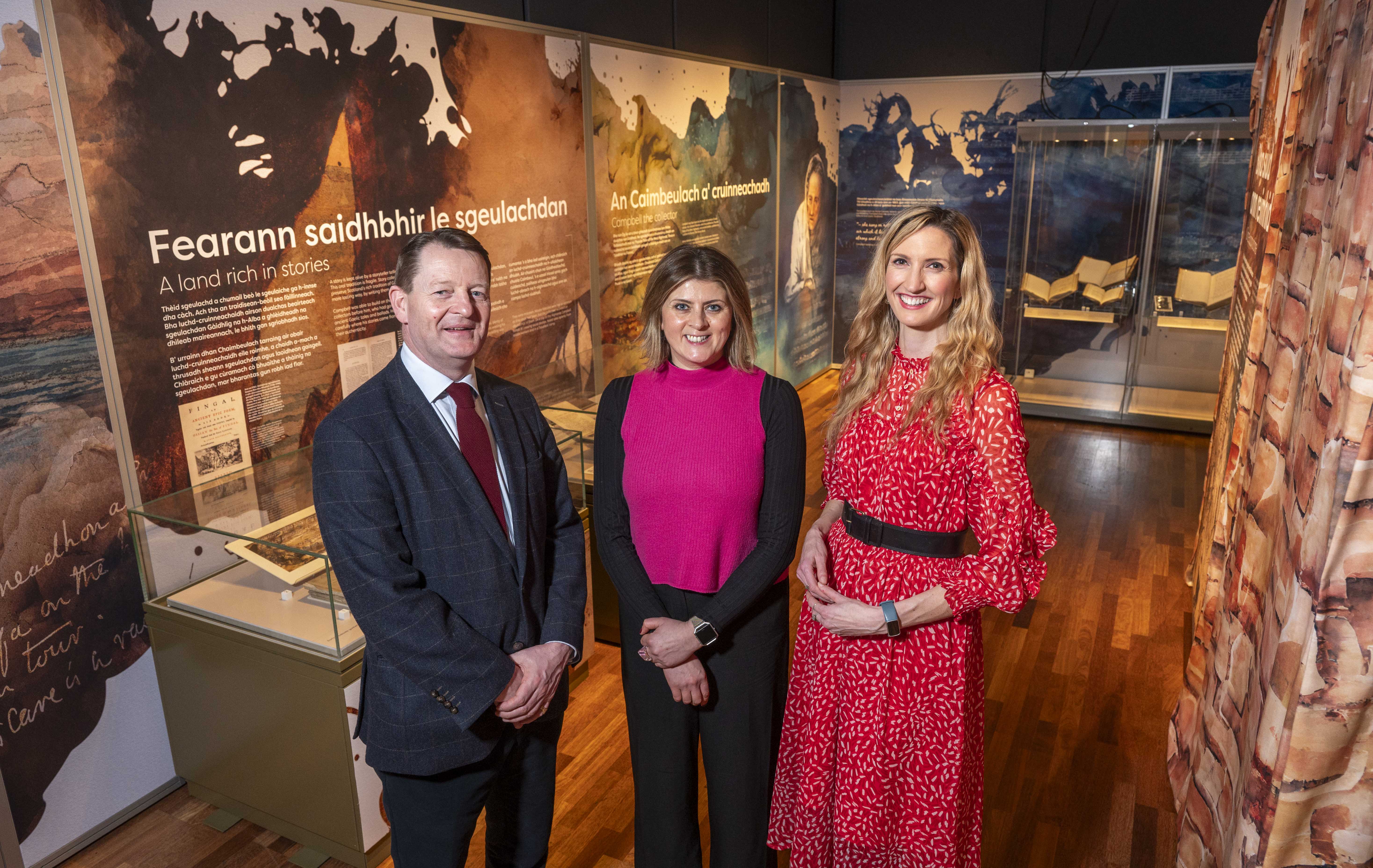 Rob Dickson, Director of Industry & Destination Development at VisitScotland, Joy Dunlop, singer and Director of Seachdain na Gàidhlig (World Gaelic Week) and Amina Shah, National Librarian and Chief Executive, National Library of Scotland, launch the Gaelic Tourism Strategy for Scotland 2024 – 2029 at the National Library of Scotland in Edinburgh. (Credit – VisitScotland / Phil Wilkinson)